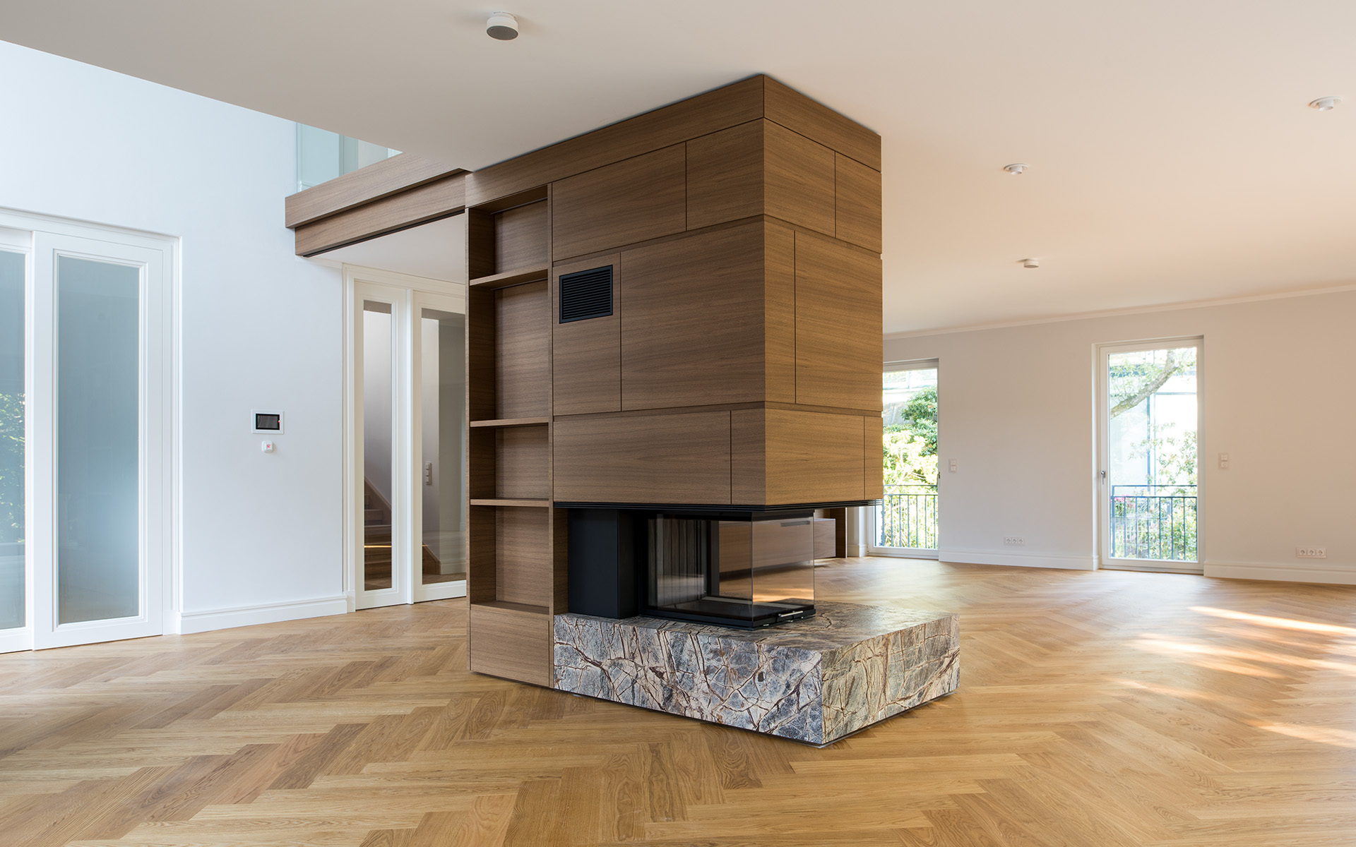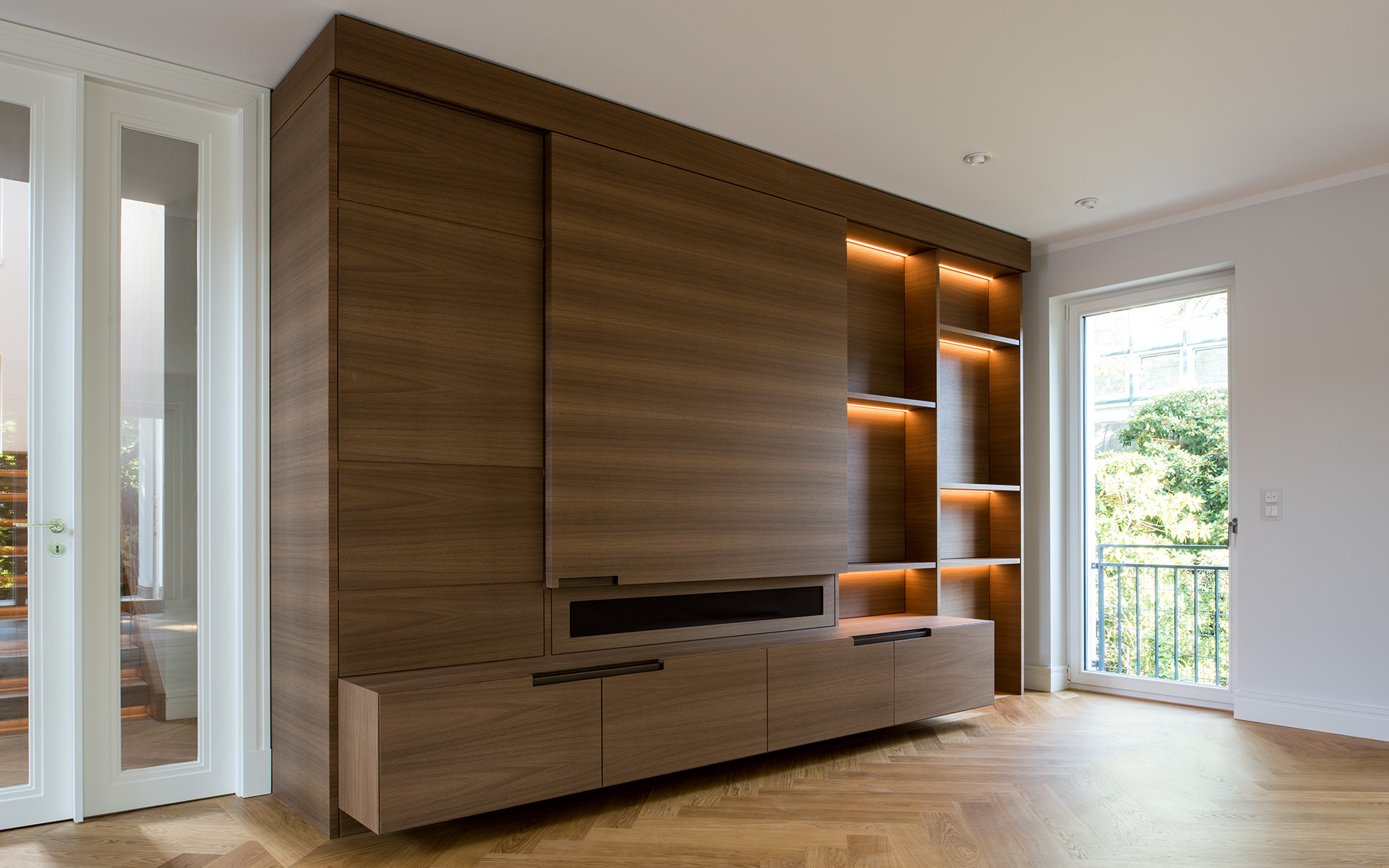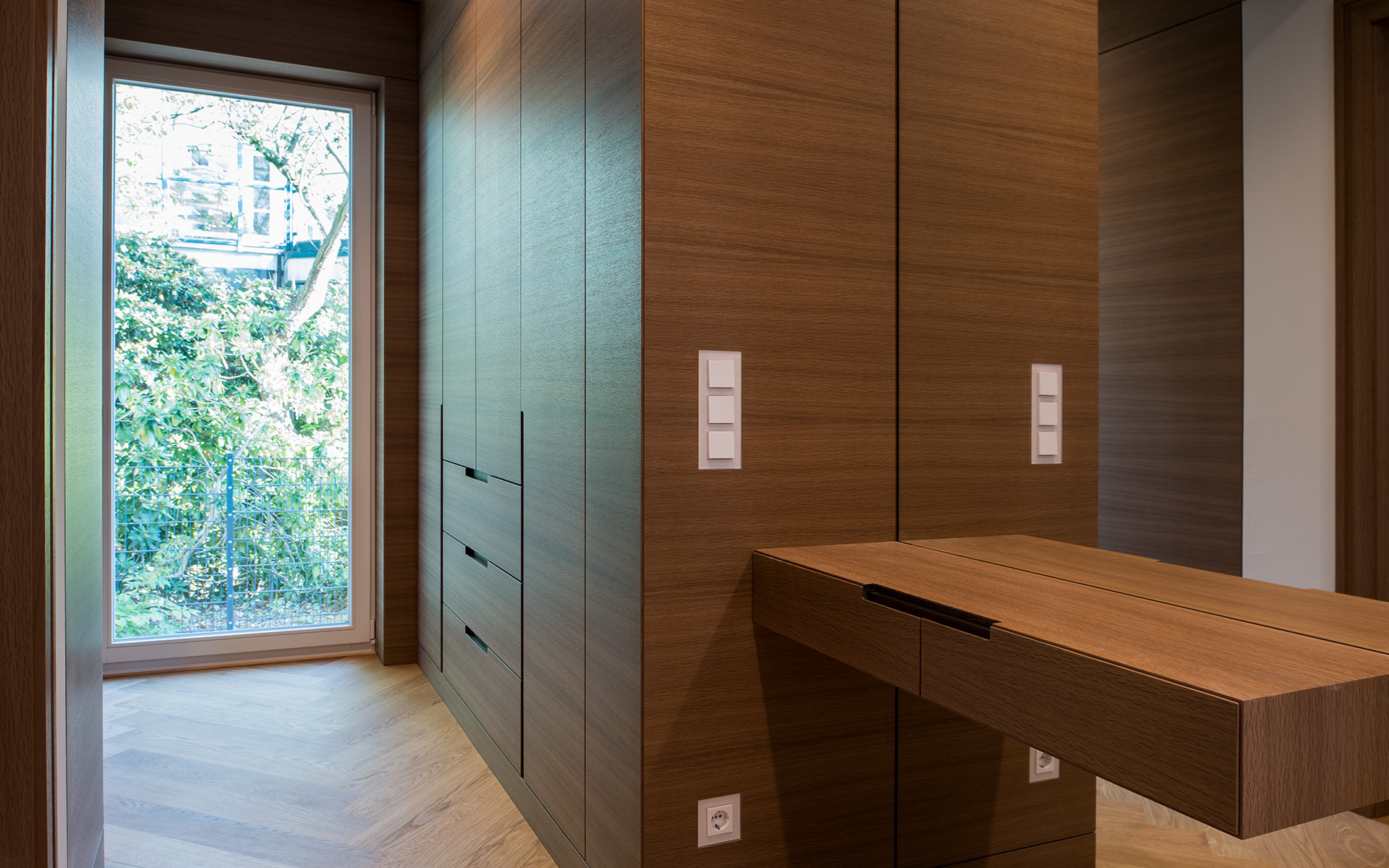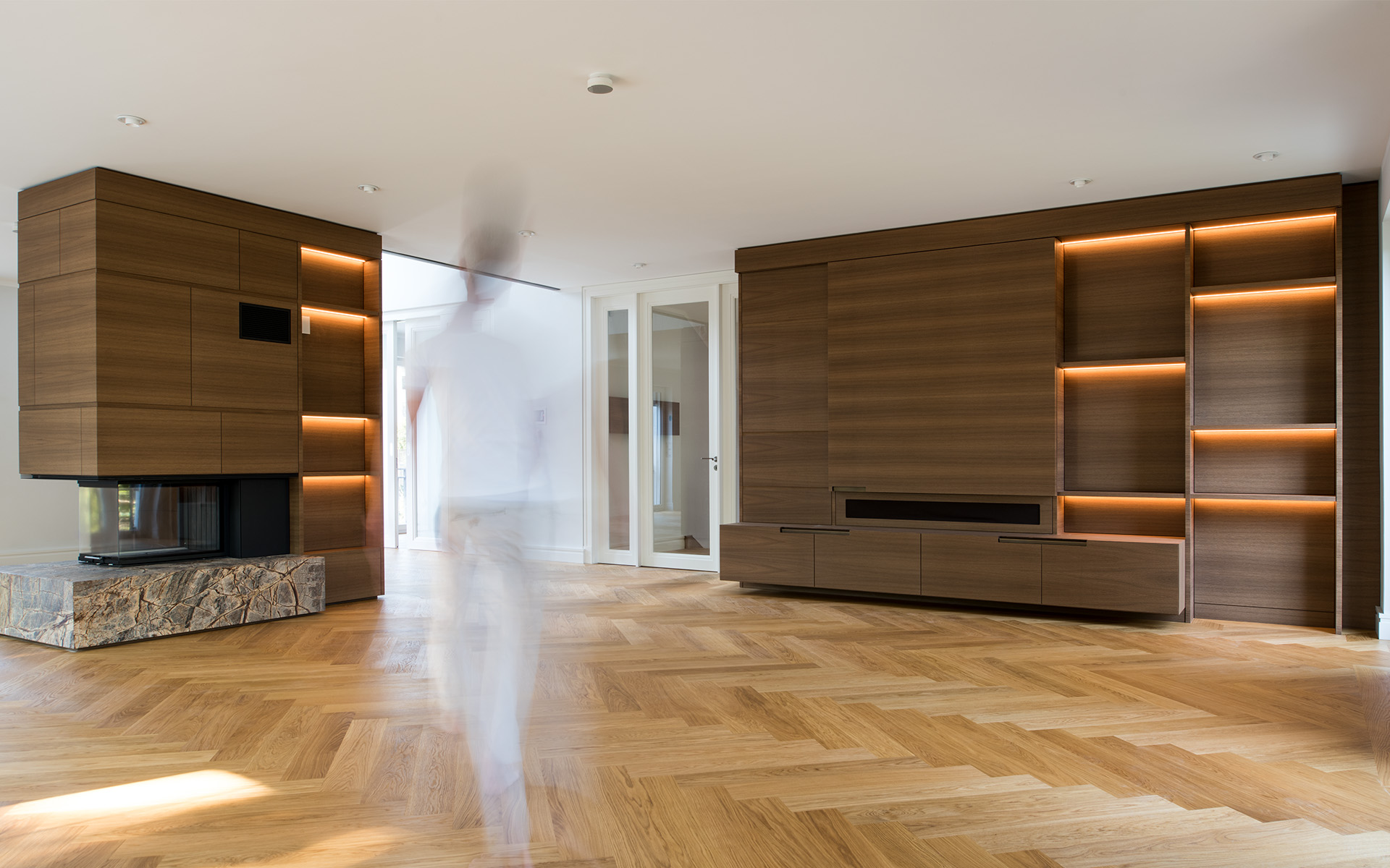 Maßgefertigte Einbauten und hochwertige Oberflächen schaffen eine zeitlose, ruhige Atmosphäre mit hohem gestalterischem Anspruch.