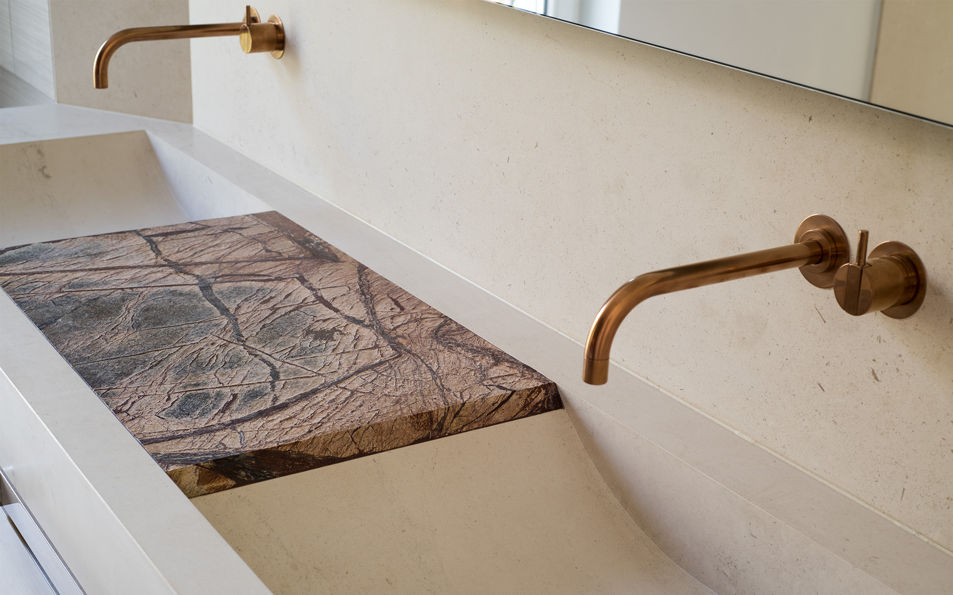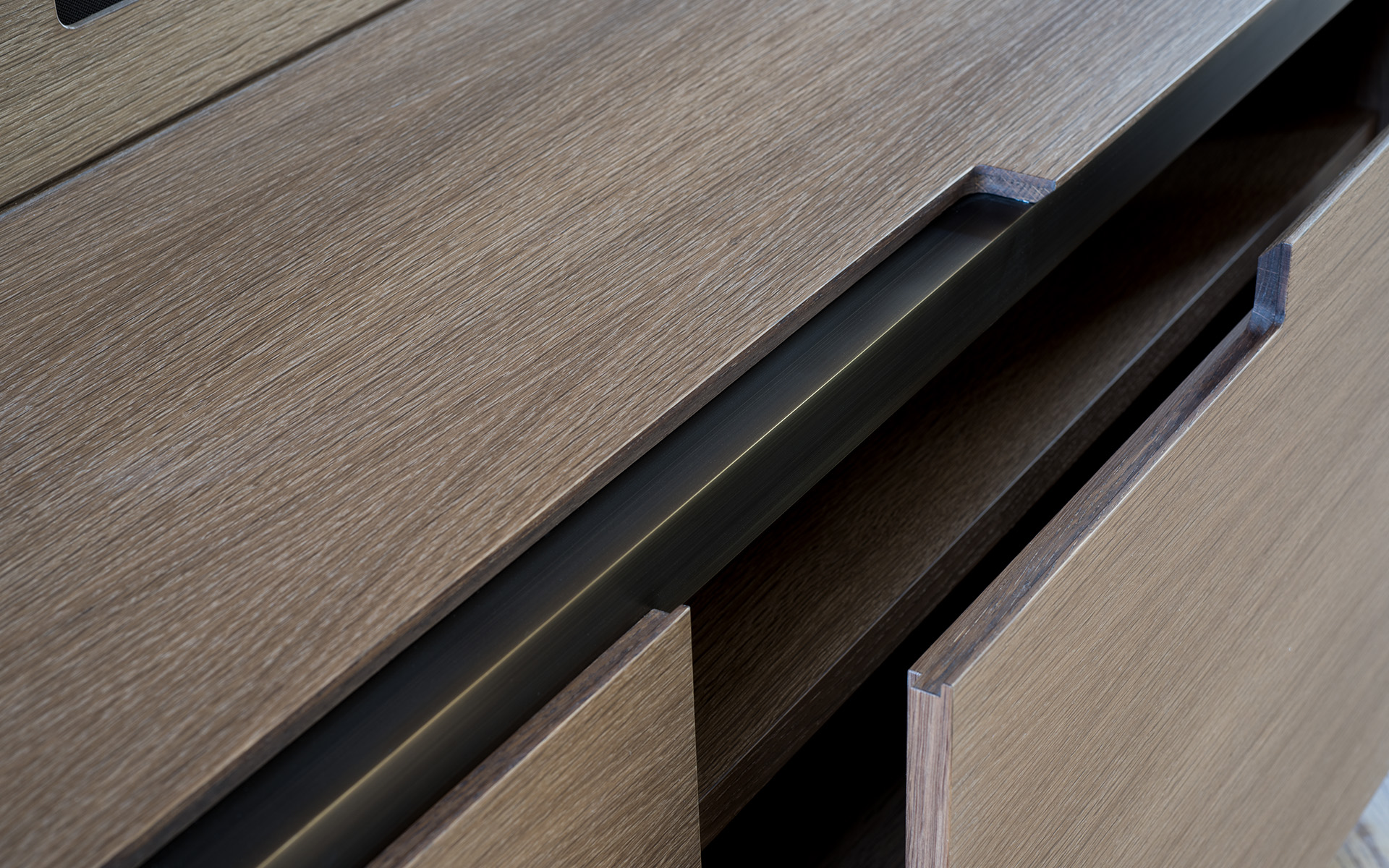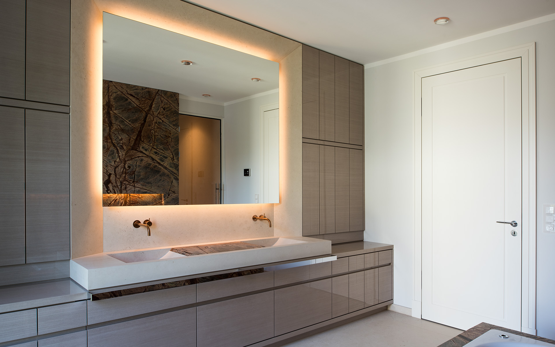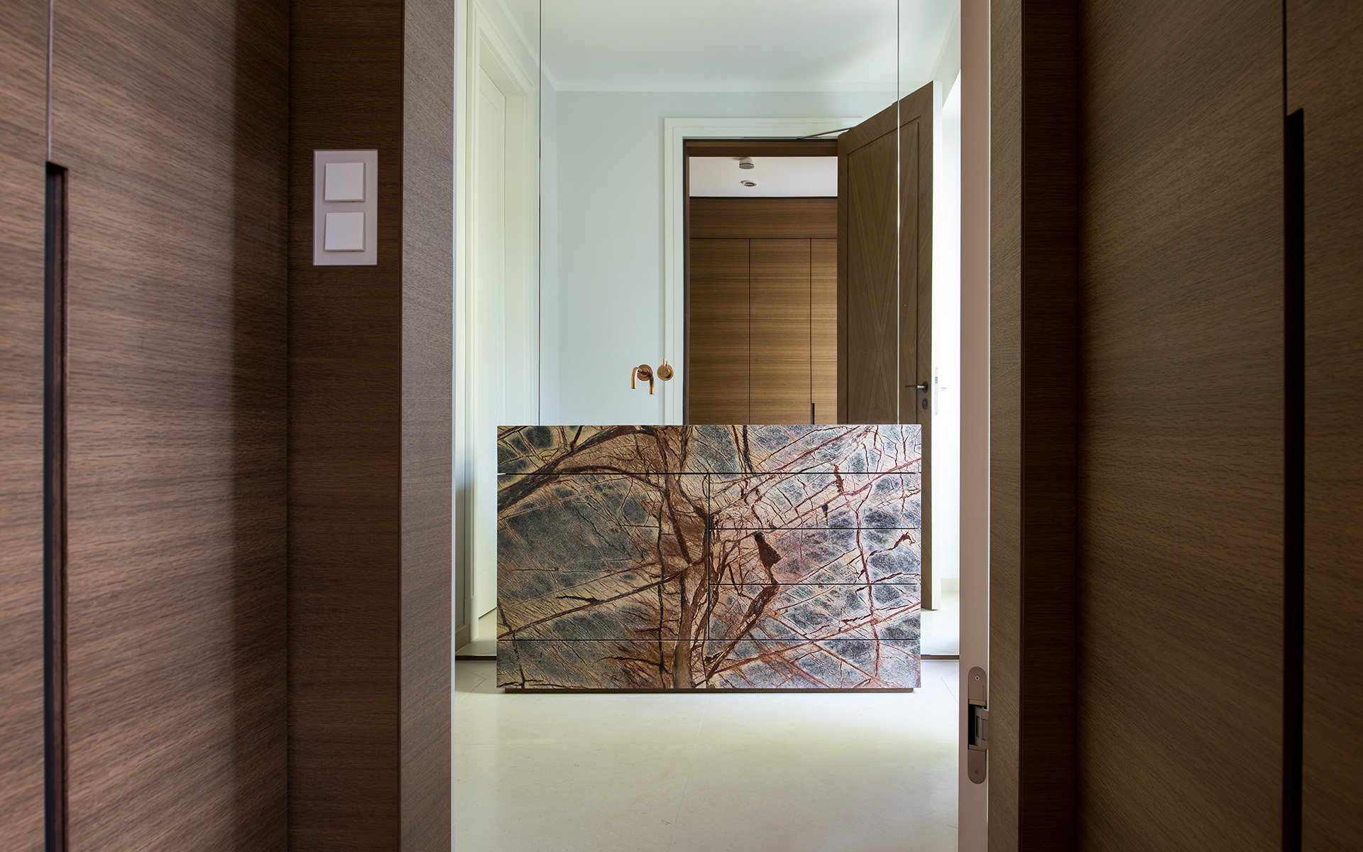 Maßgefertigte Einbauten und hochwertige Oberflächen schaffen eine zeitlose, ruhige Atmosphäre mit hohem gestalterischem Anspruch.