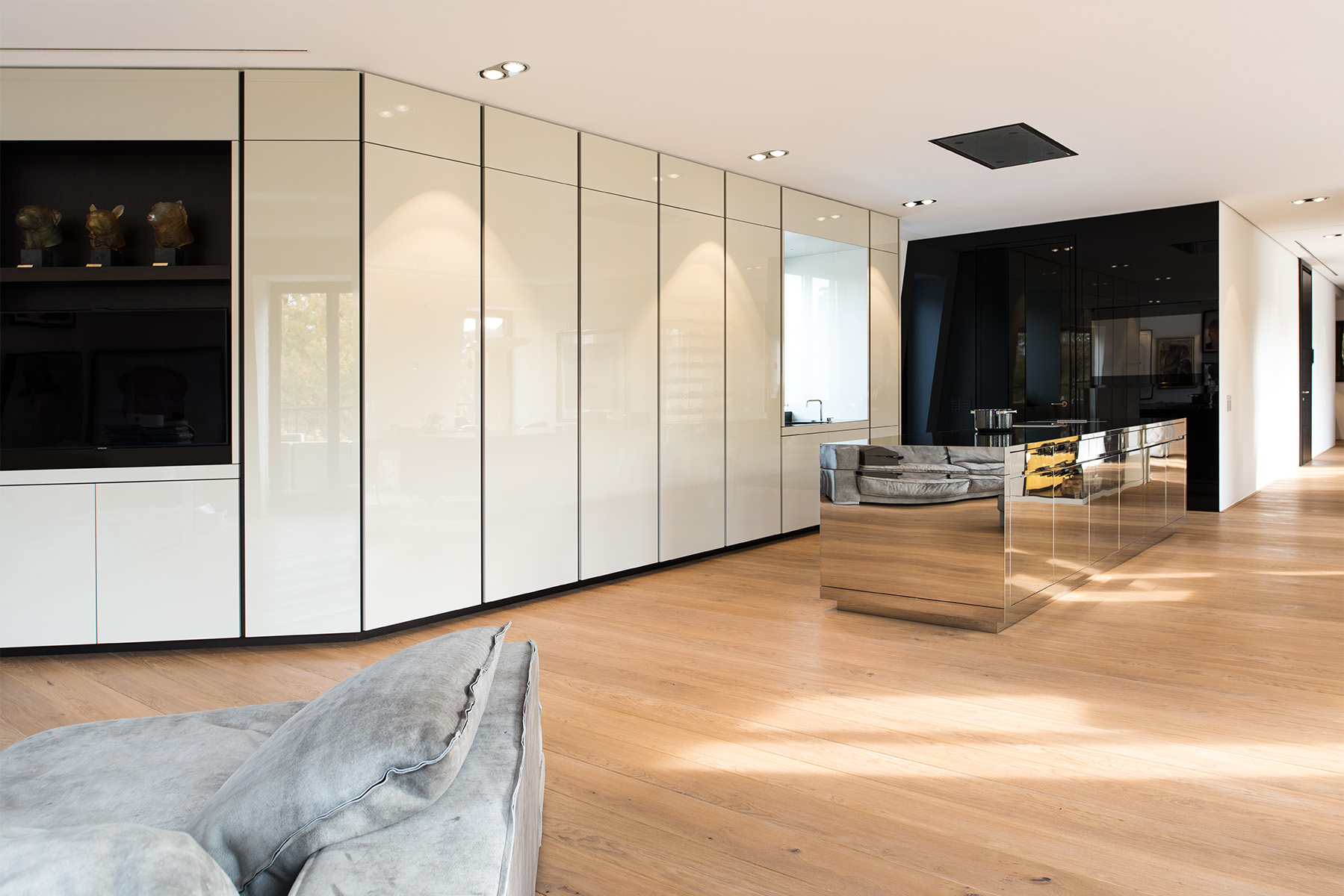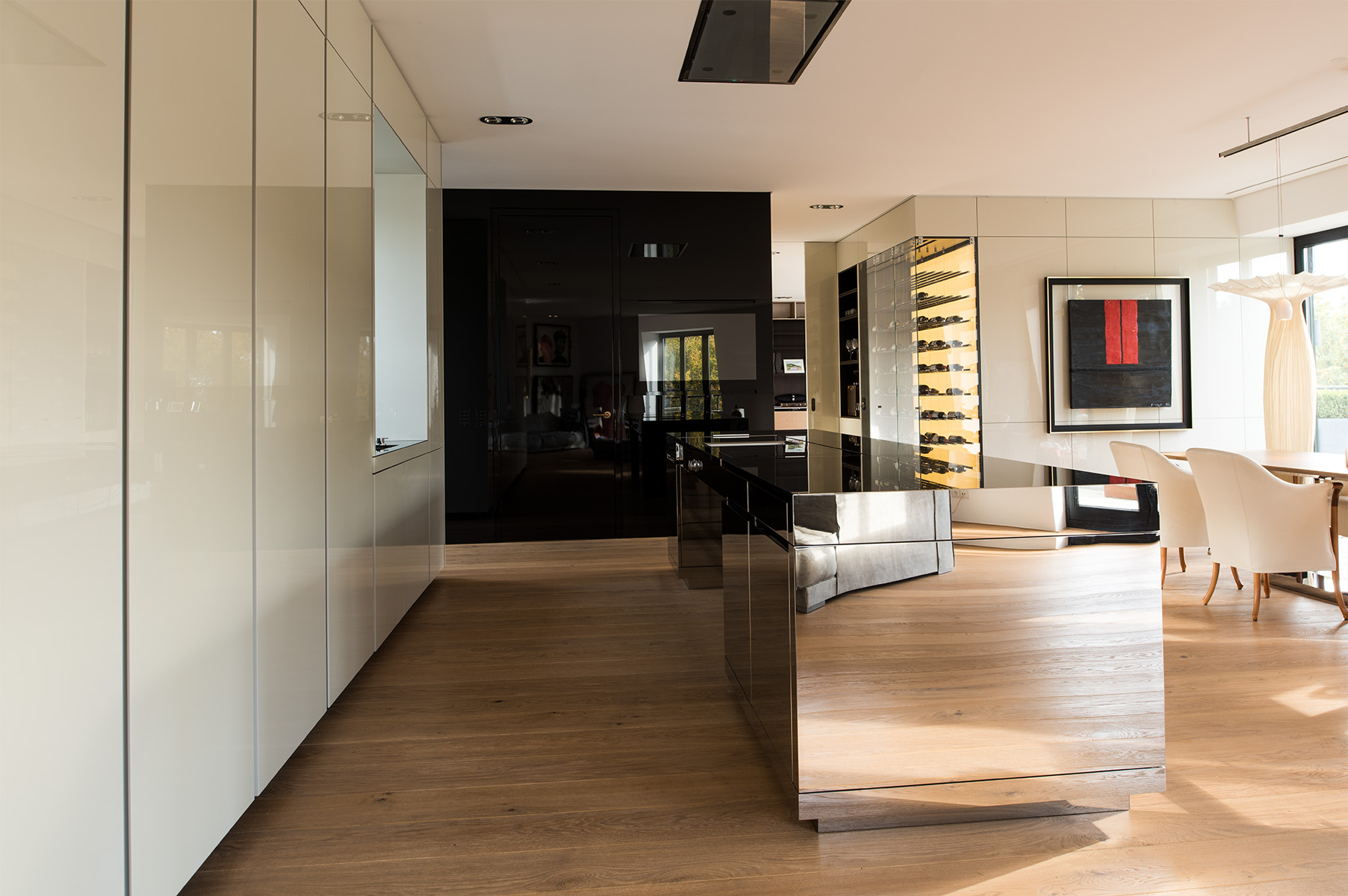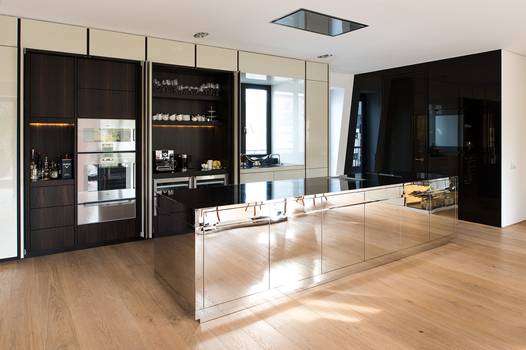 Die verspiegelte Kochinsel reflektiert ihre Umgebung und verschmilzt optisch mit dem Raum. Sie tritt zurück und ist dennoch präsent – ein stilles Zentrum, das Eleganz und Ruhe ausstrahlt. So entsteht ein Ort, der Kochen und Wohnen verbindet und ein Gefühl von Offenheit und Geborgenheit vermittelt.