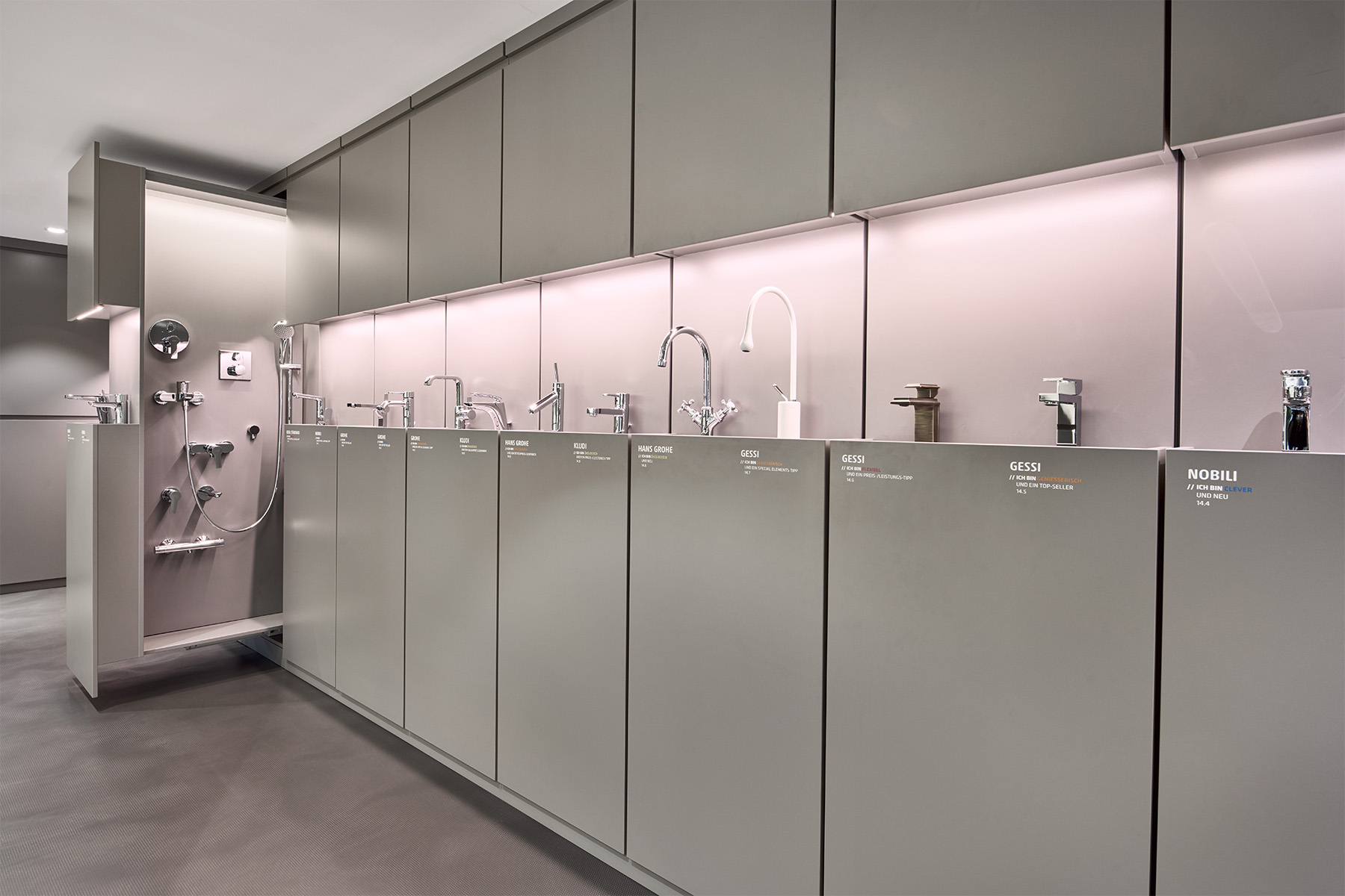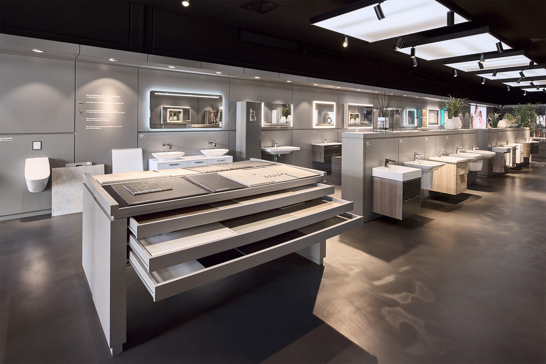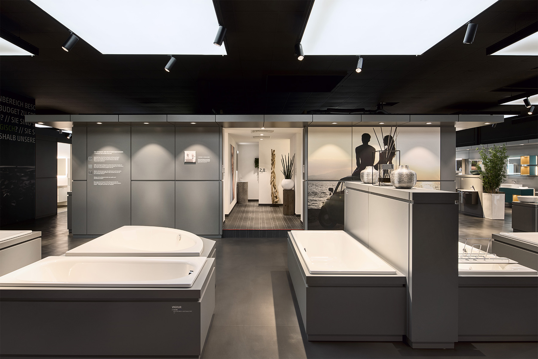 Für das Bädstudio von Elements in Bremen Osterholz entstand ein Ausstellungskonzept mit klarer Präsentation und bewusst verborgenen Details.