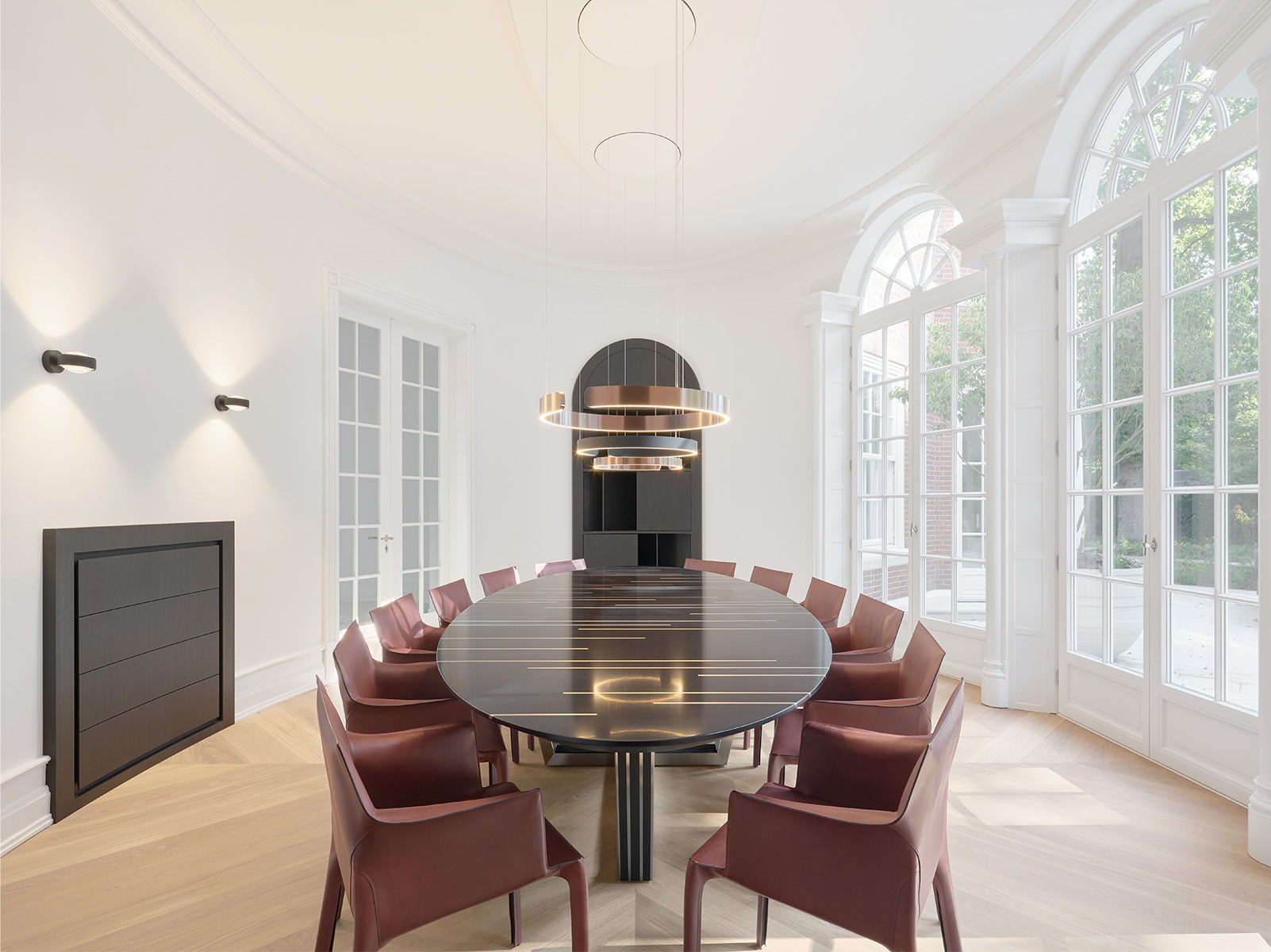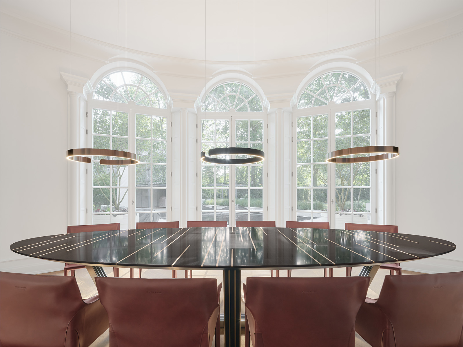 Aus einer räumlichen Designherausforderung entstand TRIIP – ein Tisch, der durch seine stark gephaste ovale Platte und das kreuzförmige Gestell skulptural wirkt und zugleich Leichtigkeit ausstrahlt. Die verspielte Kombination aus ALPI Gabo Ebony, strichmattem Edelstahl und eingelassenen Lisenen schafft eine elegante Präsenz. TRIIP ist wie gemacht für Räume, in denen Kommunikation und Atmosphäre im Mittelpunkt stehen.