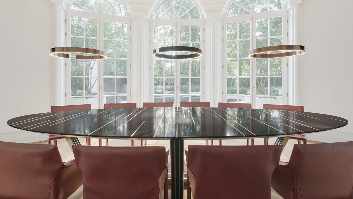 Im Zuge der Sanierung der Villa HH wurde die Küche bewusst schlicht gestaltet – mit ruhigen, eleganten Materialien und einer harmonischen Farbgebung. Die Kücheninsel mit integriertem Essplatz bildet das Herzstück des Raumes und lädt, mit Blick in den Garten zum Verweilen ein. Hängende Schränke verleihen der lichtdurchfluteten Küche eine besondere Leichtigkeit, die den hanseatischen Stil des Hauses bewahrt und zugleich modern interpretiert.